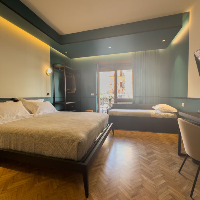 La camera V, con il suo sofisticato verde petrolio, offre un’esperienza di soggiorno esclusiva. Pensata per ospitare fino a 4 persone, combina un letto king size, un letto a castello, bagno privato e un terrazzo esclusivo per i vostri momenti di relax.